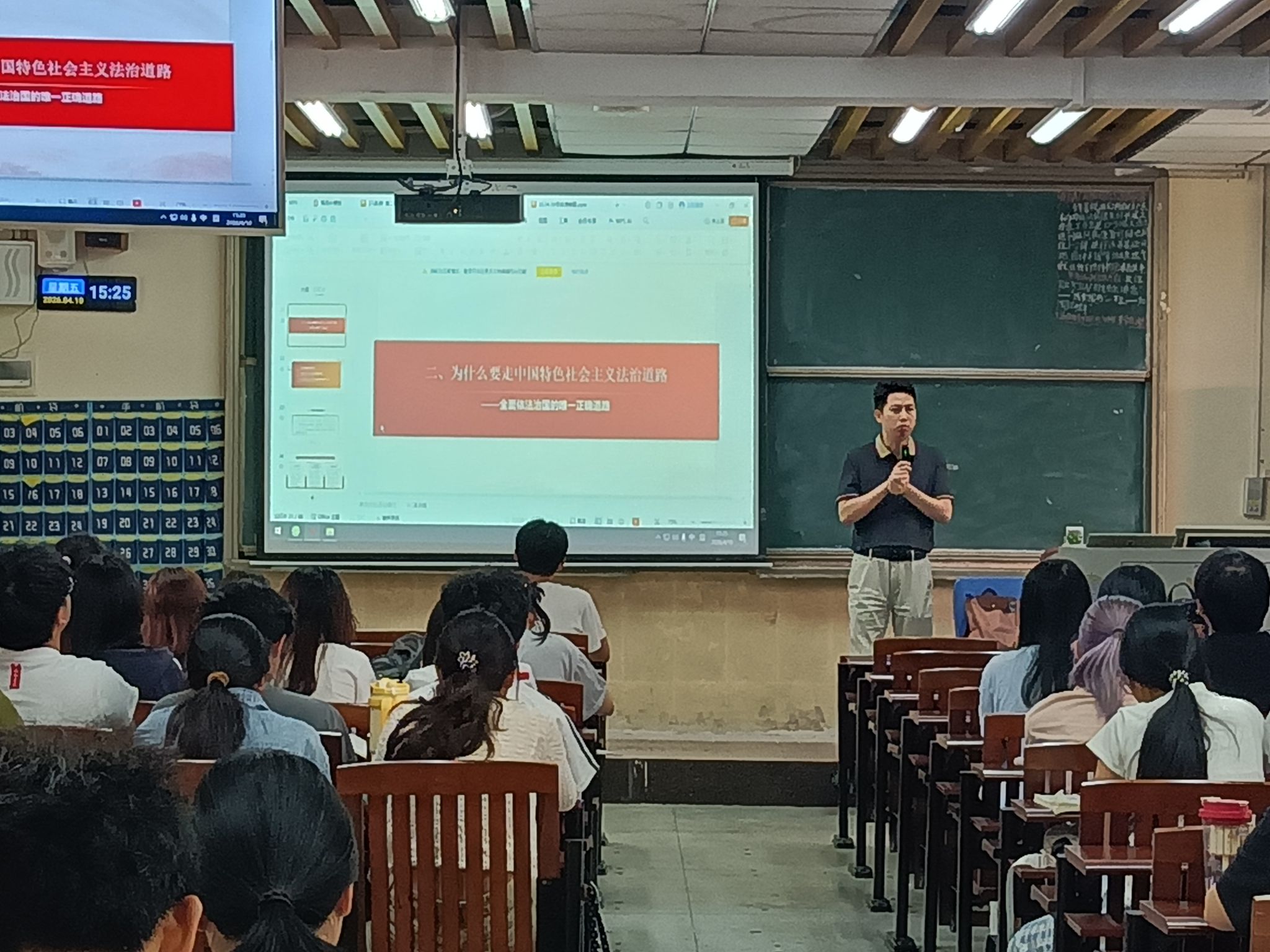 )副院长黄俊辉以“为什么要走中国特色社会主义法治道路”为主题,给2025级知识产权1班、2025级工商管理1班和2025级工商管理2班的同学讲授春季学期思政第一课,旨在加强同学们对中国特色社会主义法治道路的认同感。